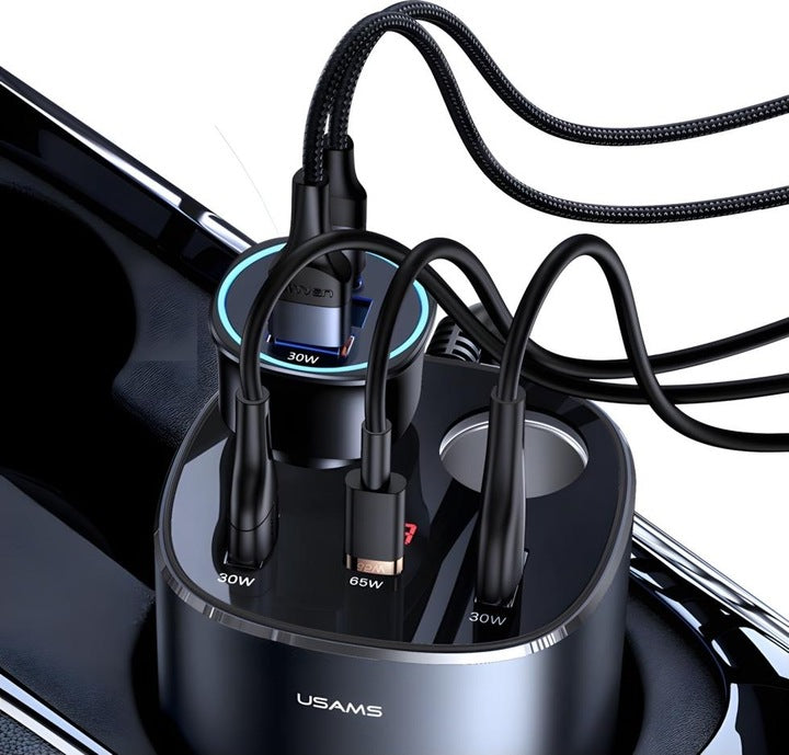 USAMS US-CC151 hub and car charger. The 5-in-1 compact charger features two cigarette lighter socket hubs, two USB ports with 30W power, and one input with 65W. The total output power is 245W, providing advanced and stable charging performance. It allows for the connection of multiple devices simultaneously. The sharing funnel includes three independent fast charging ports (USB-C and USB). Please note that the lighters do not support cigarette lighting and heating functions. The cigarette lighter input is designed for high-powered appliances such as car refrigerators and vacuum cleaners. The charger is equipped with a mechanism to protect connected devices from overheating and voltage surges.