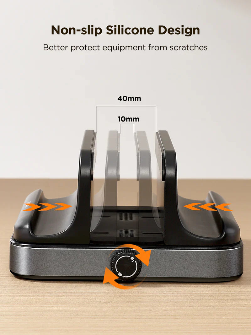 1. Multifunctional storage bracket, 3-in-1 design, compatible with laptops, tablets, phones, and other electronic devices; 2. Two-side linkage structure, Accurately adjust the width from 10 to 40mm 3. Mechanical knob design, more accurate width adjustment, more convenient operation; 4. Stable base design, larger contact area, more stable center of gravity; 5. Anti-slip silicone, all-round protection, scratch resistant;