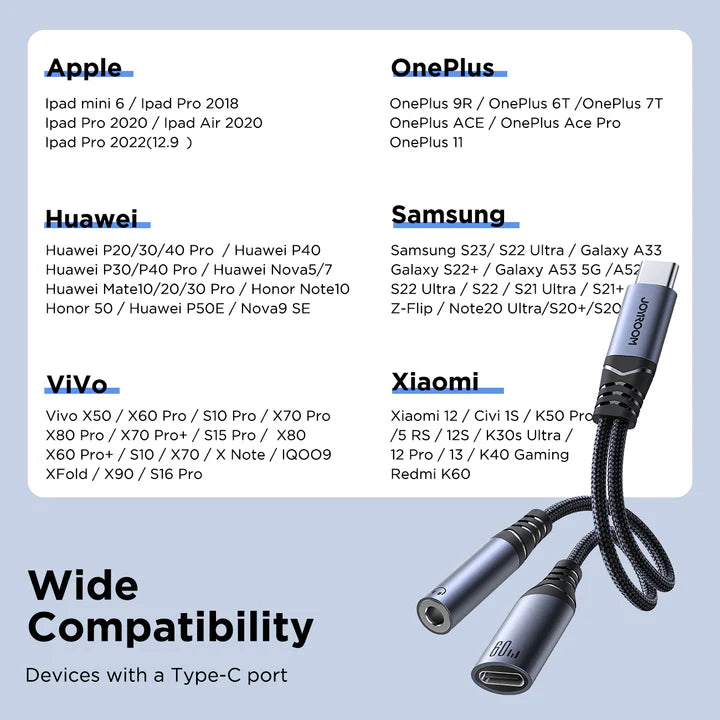 Multifunctional adapter, calling/60W/music/mic/in-line control. 60W PD fast charging, charge while you listen to music. HiFi sound quality, restoring stereo sound effect.