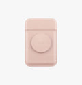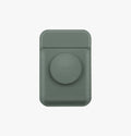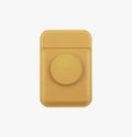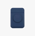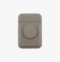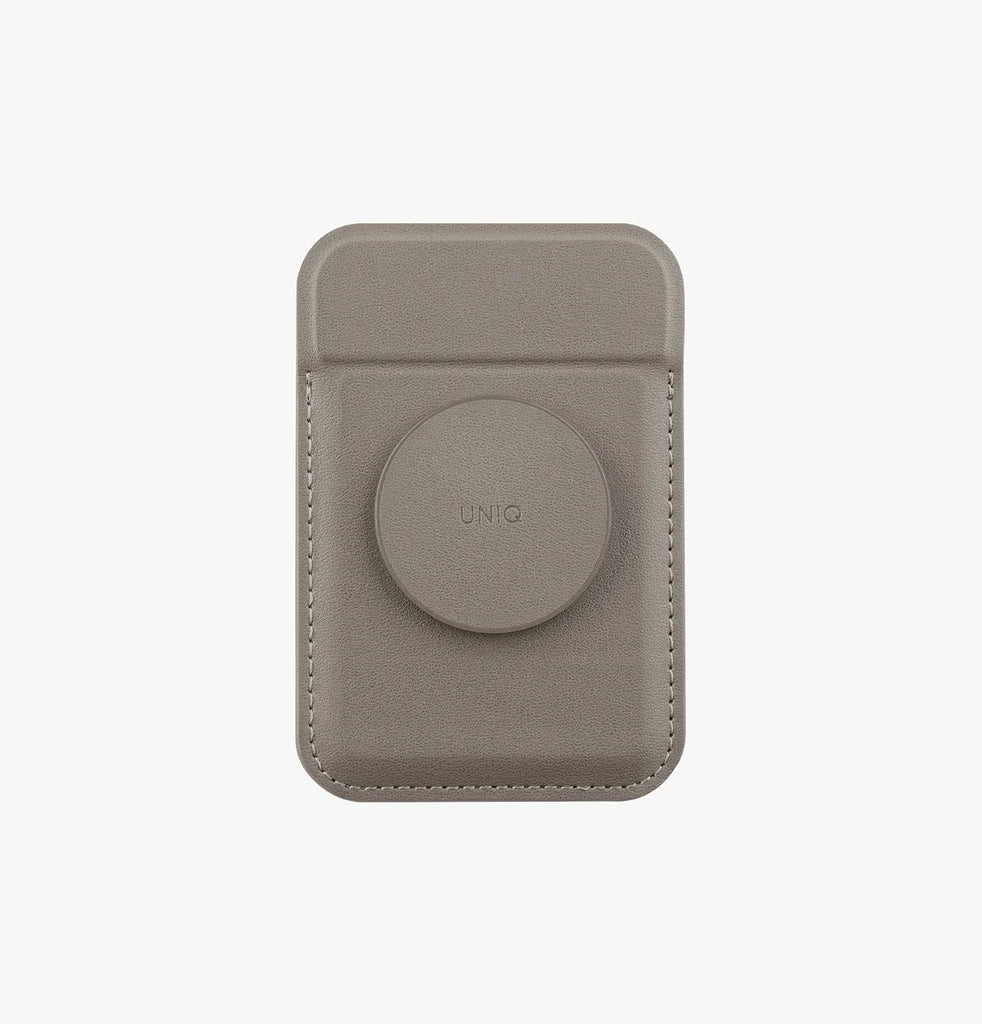 Magnetic card holder with integrated popout grip and stand. Centralised disc-style grip design provides ergonomic grip and full reachability of screen when texting or browsing. Secure locking stand design optimized for hands-free landscape orientation viewing for video calls.