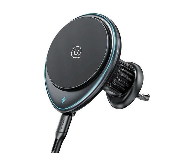 The US-CD222 inductive holder from Usams is a practical wireless charging mount specifically designed for use in the car. With a power output of up to 15 watts, it enables fast and efficient charging of smartphones, particularly the iPhone 12-15 series. The device features an integrated magnet that ensures easy and secure attachment of the smartphone. The holder is mounted on the vehicle's ventilation system, providing convenient use while driving. The use of high-quality materials such as ABS, PC, and acrylic ensures durability and stability. Additionally, the charging mount is equipped with a soft, pleasant light that creates a comfortable atmosphere in the vehicle. Installation is straightforward and quick, allowing users to immediately benefit from the advantages of wireless charging.
